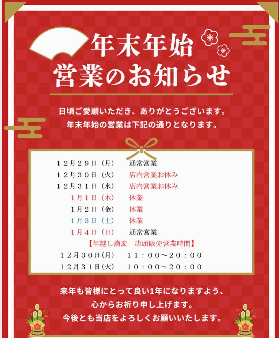 12月30日・31日(大晦日)の店内営業は致しませんのでご了承下さい。
