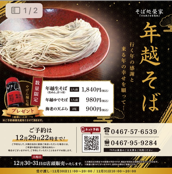 茅ヶ崎蕎麦処榮家からお知らせ 年末毎年恒例大晦日 【年越し蕎麦】 今年も店頭にて年越し蕎麦の販売をいたします。 ・年越し生蕎麦2人前1840円(税込み) ・年越し茹で蕎麦1人前980円(税込み) ・海老の天婦羅2尾900円(税込み) ご予約は御来店・お電話・メールフォームでも可能でございます。 また数量限定(ご予約優先配布)で お1組様お一つ 【やげん堀七味】を粗品で プレゼント致します。 【店頭販売営業時間】 30日11:00から20:00 31日10:00から20:00となります。 253-0082 神奈川県茅ヶ崎市香川4-11-14 0467-57-6539 ご予約最終受付日時は12月29日22時までとなります。 ご予約お待ちしております。 インターネット予約(メールフォーム)はこちら ↓↓↓ https://soba-sakaeya.com/event.html #茅ヶ崎蕎麦処榮家 #年越し蕎麦予約受付中